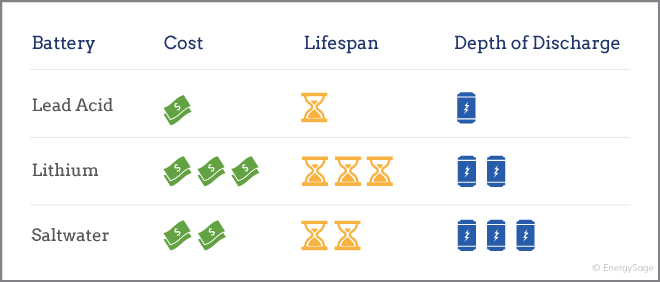 Batteries used in home energy storage typically are made with one of three chemical compositions: lead acid, lithium ion, and saltwater. In most cases, lithium ion batteries are the best option for a solar panel system, though other battery types can be more affordable.